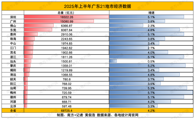 总量方面,深圳、广州、佛山、东莞、惠州位列全省前五。增速方面,梅州、汕尾、肇庆三地领先,深圳、惠州、湛江、潮州并列第四。透视这份“半年报”,可以看到上半年全省各地经济运行的几大特征>>